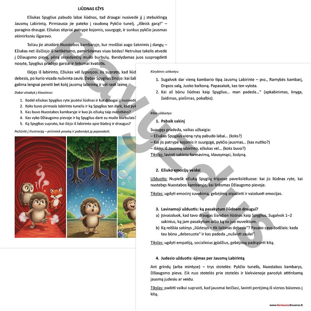 ❓ Suvokimo klausimai: „Dabar atsakyk į klausimus“ skiltis padeda patikrinti, ar vaikas atidžiai klausėsi ir suprato esmę.