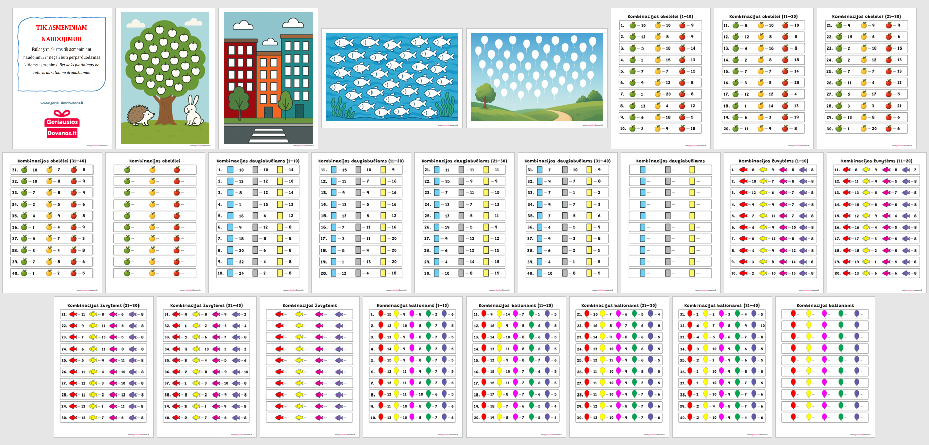 Kiekvienoje užduotyje pateikiamos skirtingos spalvų ir skaičių kombinacijos, kurios lavina vaikų: